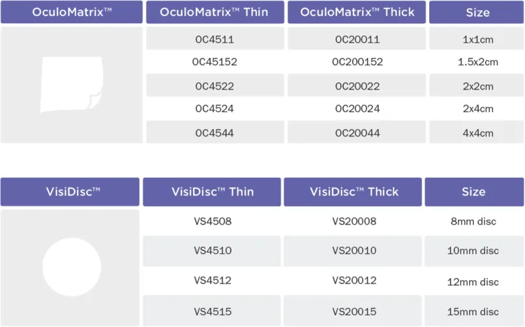 OculoMatrix® & VisiDisc® Thick are chorion-based grafts, providing alternative handling characteristics and improved visibility for minimally invasive and other applications. They have a nominal thickness of 200 microns.